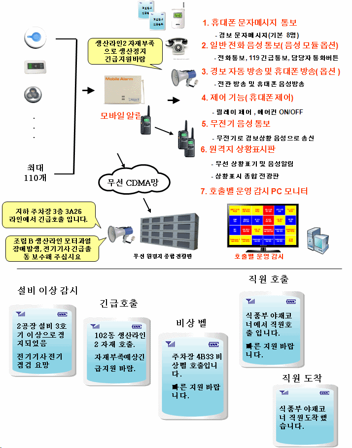 아파트 및 빌딩 주차장의 취약지구에서 경비를 호출하거나, 공장의 생산라인에서 설비 기술자를 호출하여 설비 Down 시간을 최소화하고, 수영장이나 대형매장에서 상품 문의하기 위한 담당자 호출하기 등 빠른 서비스 대응이 요구되는 분야에서 사용하는 휴대폰 문자/음성 호출, 무전기 호출시스템입니다. 긴급호출 벨을 누르면 바로 담당자의 휴대폰으로 호출 내용이 전달되고, 무전기로 통보해 줍니 다.